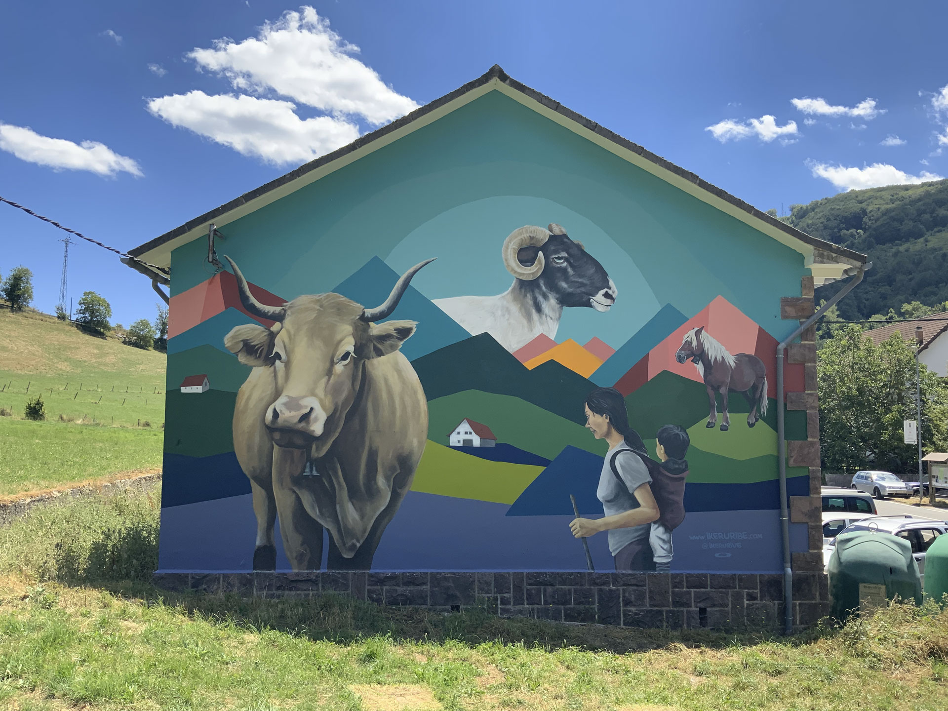 Horma irudia Aribe herrian, Aezkoan, Nafarroa. Nafarroako pirineotan kokatua, bailara hau Irati oihanaren ondoan dago, Europako baso zabalenetako bat. Bailarako herritarrak oso aintzinetik artzantza eta basogintza izan dute bizimodu. Kolorez betetako horma irudi honek lurrean eta gure arbasoen bizimoduan sustraitutako etorkizuna sinbolizatzen du.