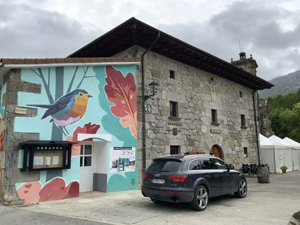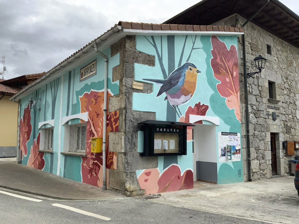 Herriko udaletxe eta ostatu ondoko eraikinean kokatuta dago horma irudia. Haritza da Arruazuko armarrian agertzen den zuhaitza da eta irudiaren elementu nagusia izan da kolore eta bizia emateko espazio honi.